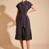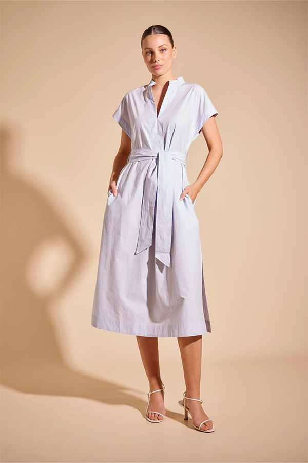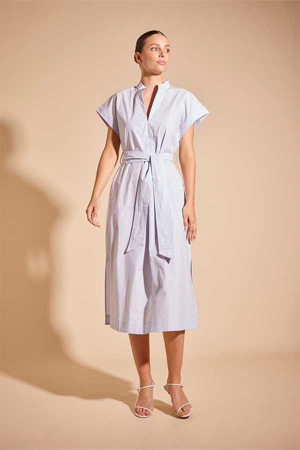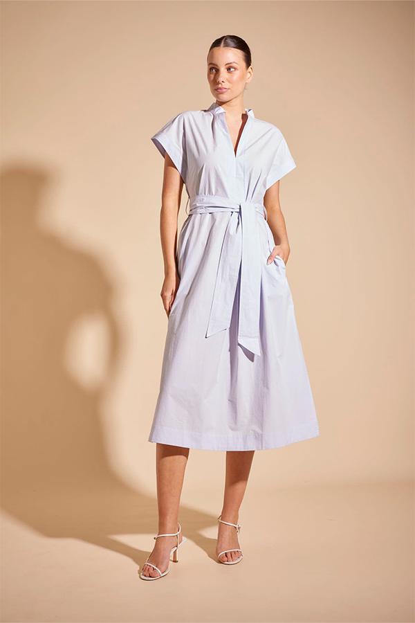 Classic style midi lenbth Alessandra Aviva Dress Lilac has cap sleeves, V-neckine, belted waist and side split at the hem.