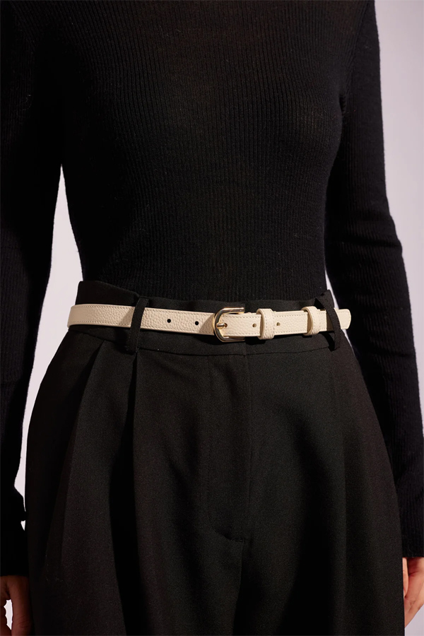 The pebbled leather Alessandra Bertie Belt Cream has a secure belt loop and gold buckle.
