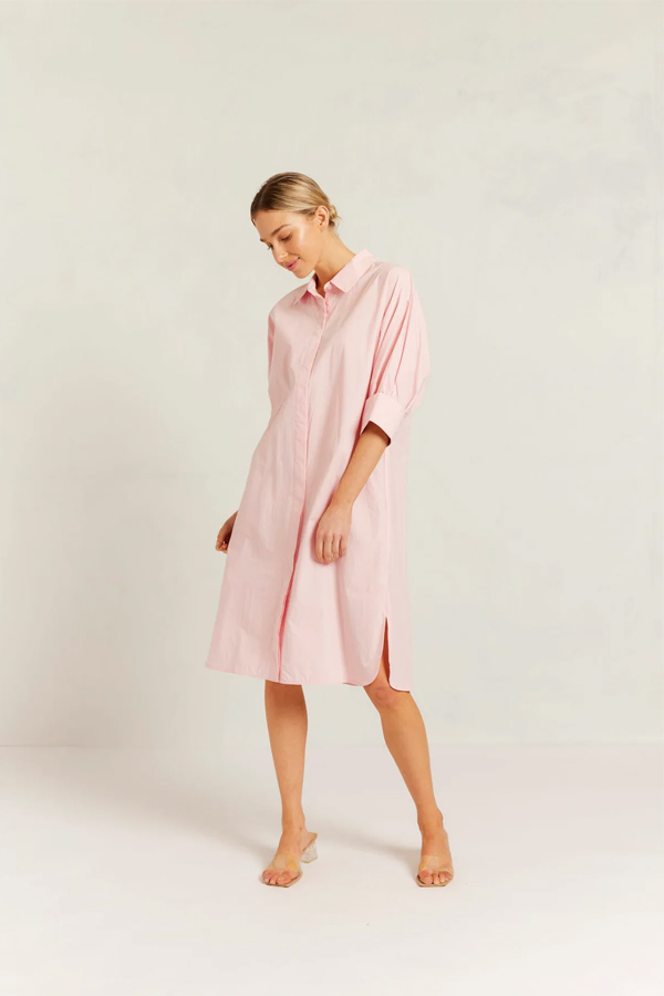 The elegant Alessandra Briar Dress Petal is crafted from luxurious 100% Pima cotton, renowned for its softness, durability, and breathability.