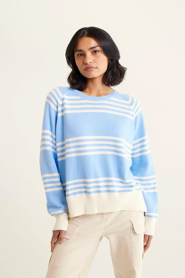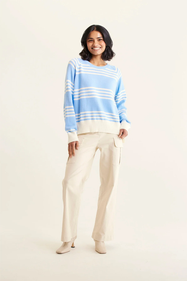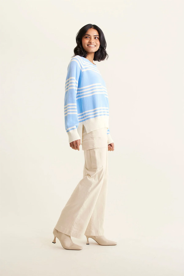 The Alessandra Cascade Sweater Cornflower features a crew neck with ribbed trim, fully fashioned raglan armhole, stripe pattern on body and sleeves and a high-low hem with side splits.