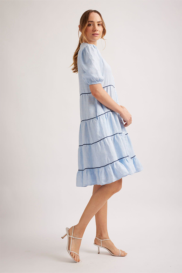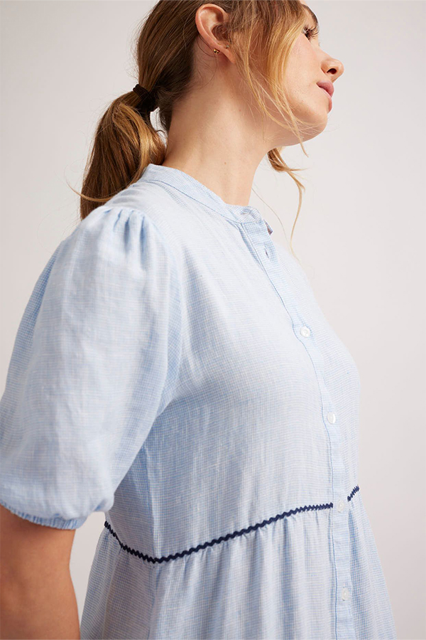 The Alessandra Marcella Dress Houndstooth Pale Blue is a soft and light linen midi dress with button down front, tiered skirt and side pockets.