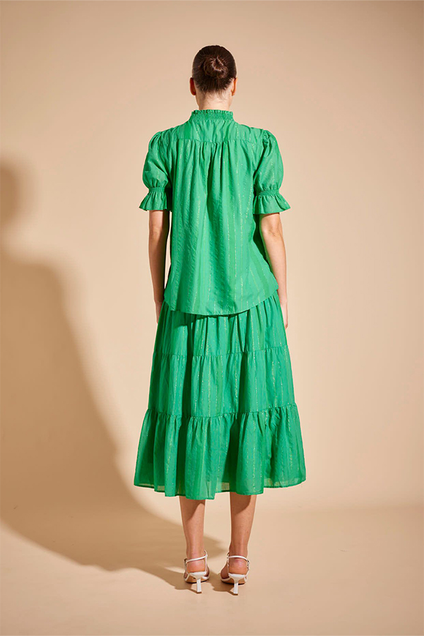 The Alessandra Verona Shirt Stripe Green is a lightweight and flowing top with button down front and puff shirred sleeves.
