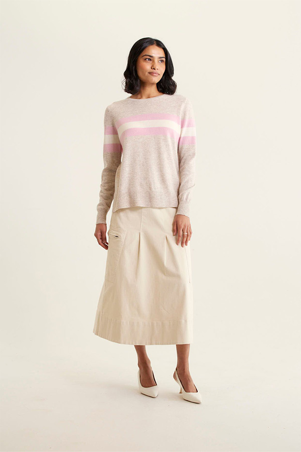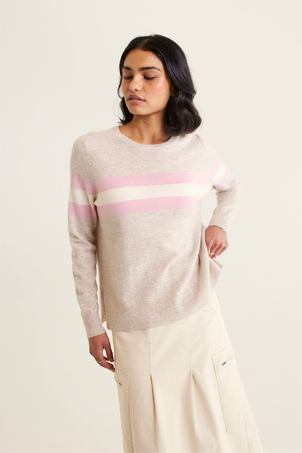 The Alessandra York Sweater Beige features a beige coloured wash all over detailed with a bold pink and white stripe across the top.