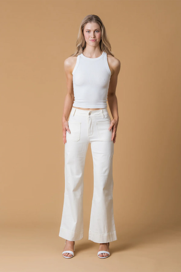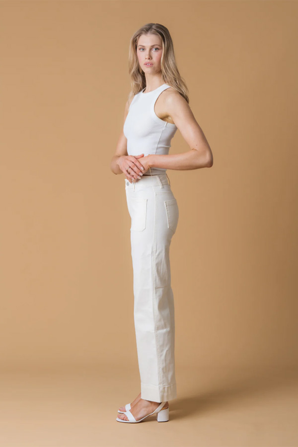 The Atte Helena Jean Champagne are designed for a versatile and flattering fit, these pants feature a classic bootcut silhouette with functional front and back pockets for both style and convenience. Finished with a sleek silver button closure for a touch of detail.