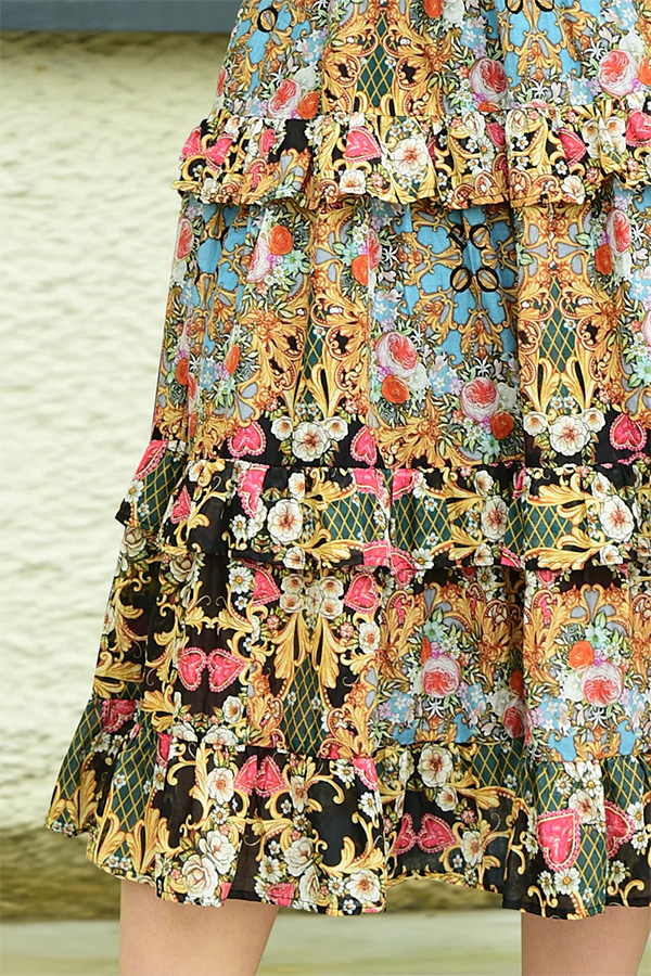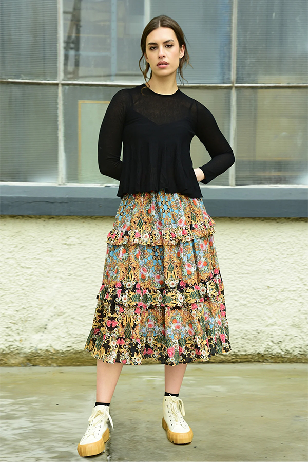 It features a tiered with flounce trim, elasticated waist and midi length.