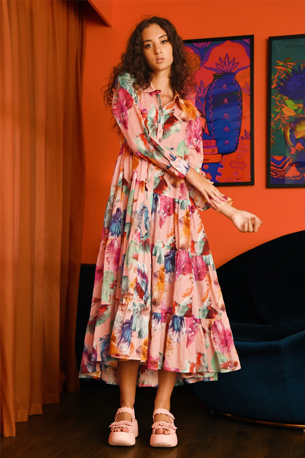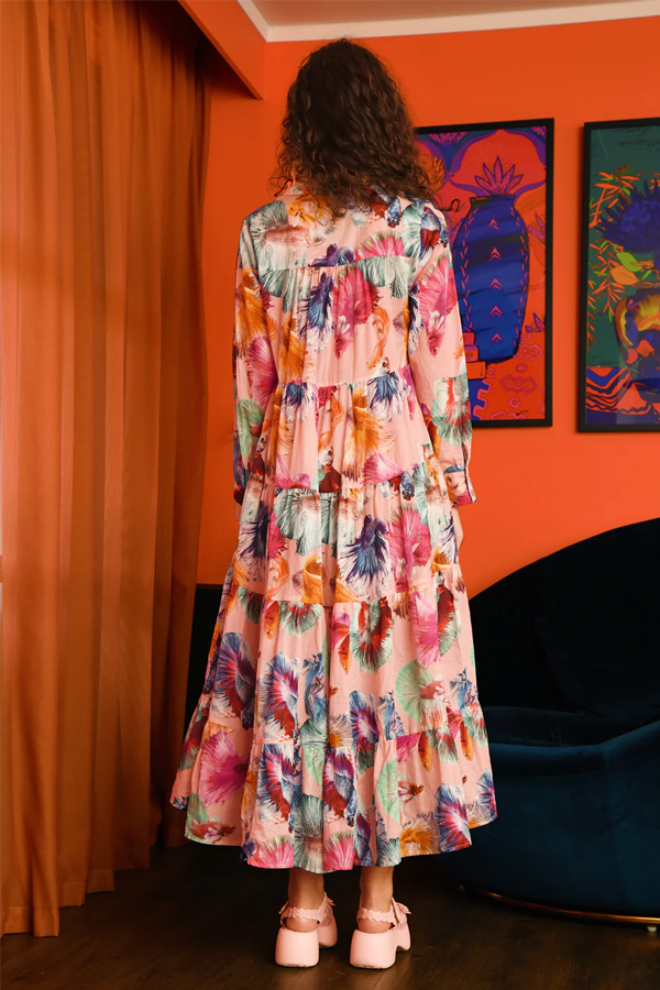 Crafted this spring in the signature COOP Fish Out of Water printed cotton voile the Coop Sun & The Swoon Dress Peach is lightweight and easy to wear – perfect for any summer evening.