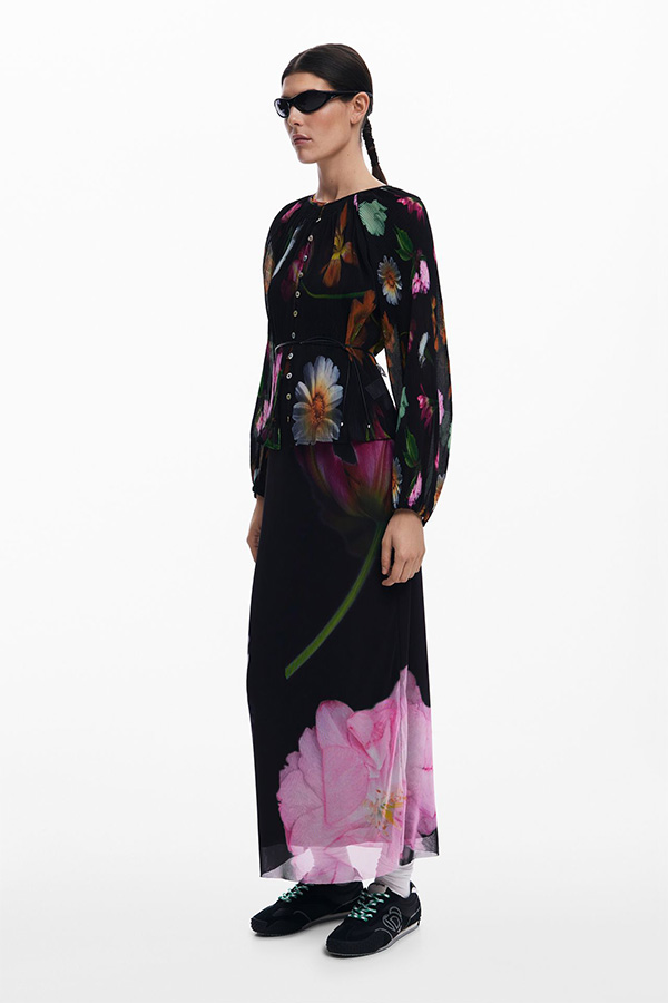 Tailored in an effortlessly flowing silhouette, designed with a black fabrication enhanced by white and pink flower prints.