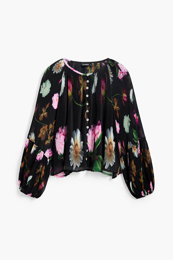 The Desigual Blouse Negro Print features a full button down, round neckline and slightly puffed sleeves.