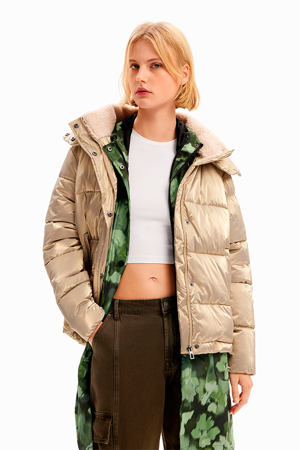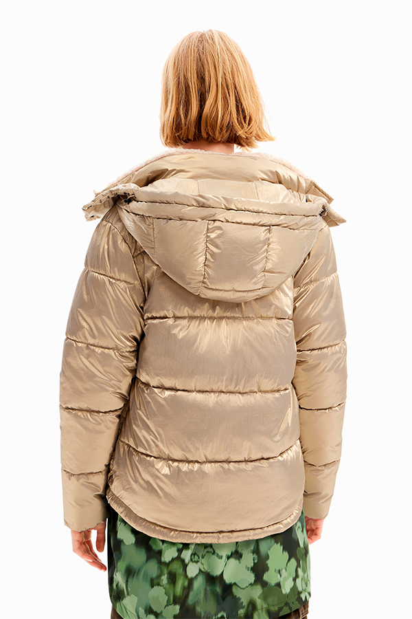The padded Desigual Coat Oro Crema has a hood, two pockets, fleece inner collar and metallic padded fabric.