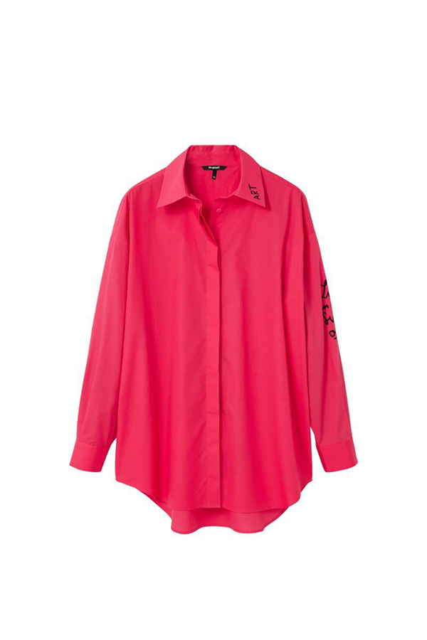 The oversize longer length poplin Desigual Shirt Fucsia has long sleeves, shirt collar, concealed button down front and longer hem at the back.