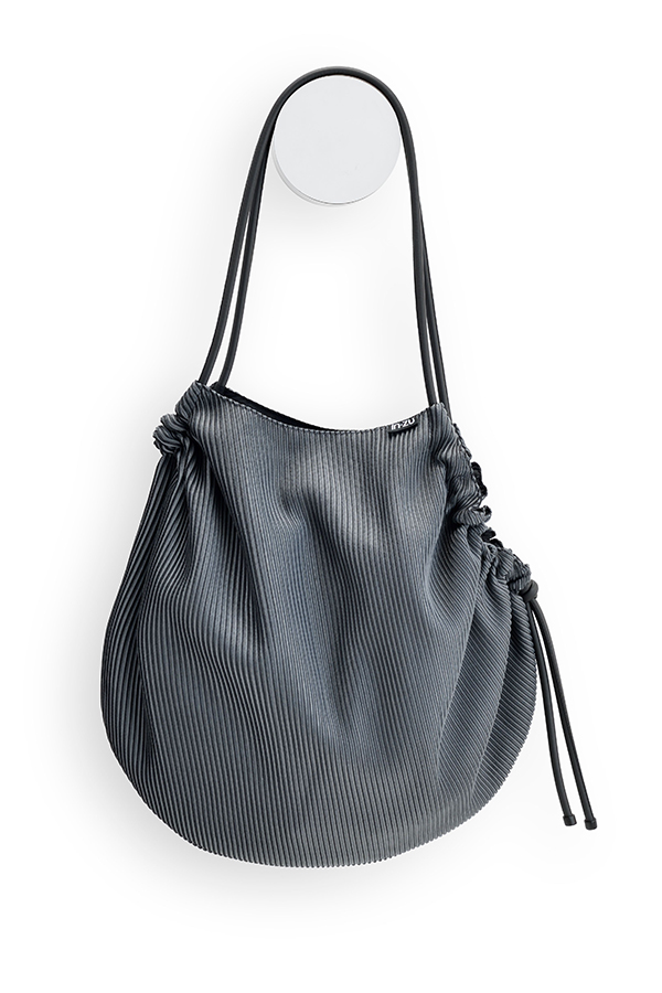 The In.Zu Cocconeo Bag Black Grey Lines is a lightweight bag with shoulder straps, with grey lines embossed in a shimmery fabric, and drawstring detail at the side.