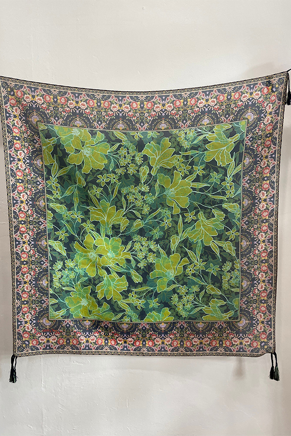 Imagined in a green color scheme, this scarf is enhanced by an eye-catching print, a contrast border, and tassels at the corners.