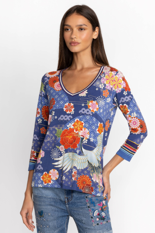 Johnny Was Pajaro Favorite 3/4 Sleeve V-Neck Tee Multi