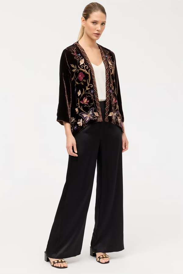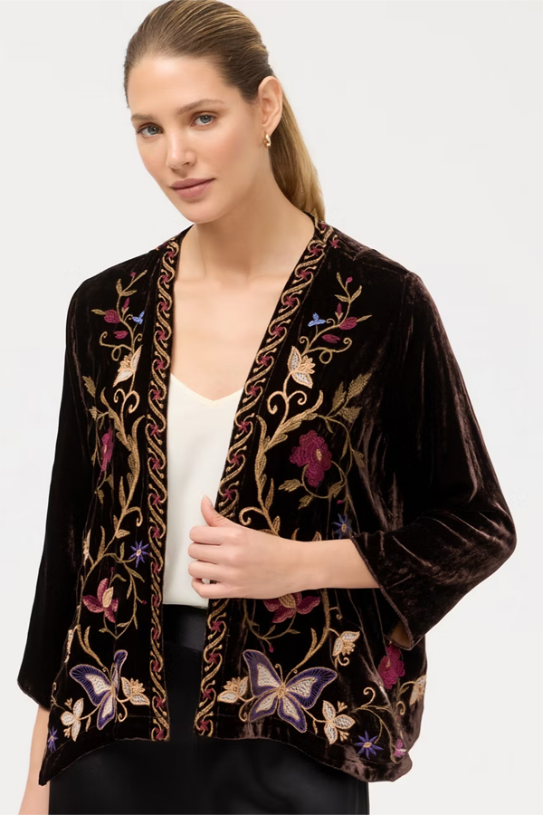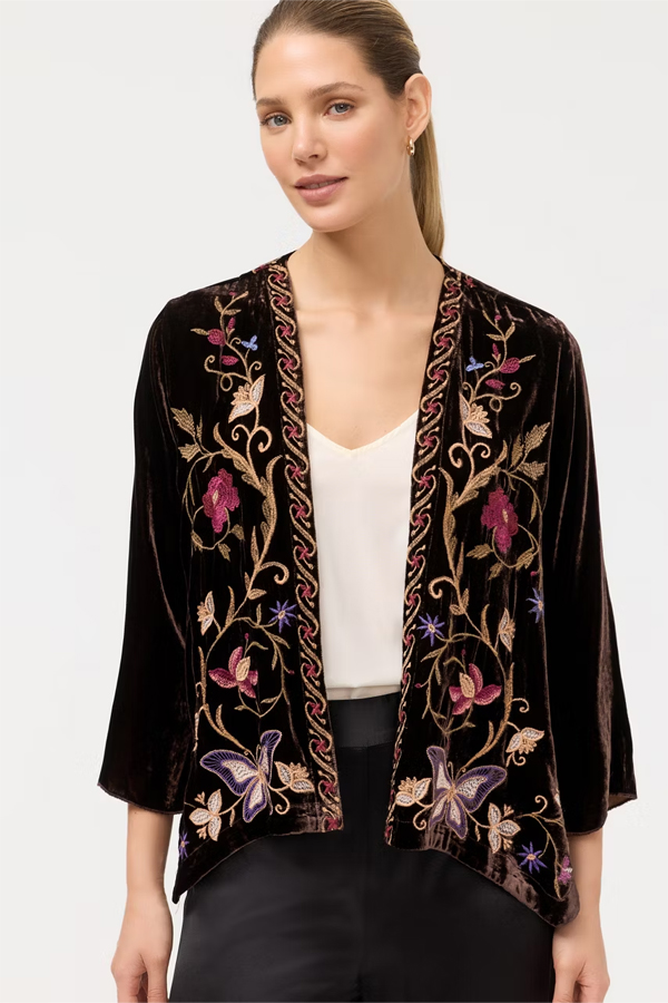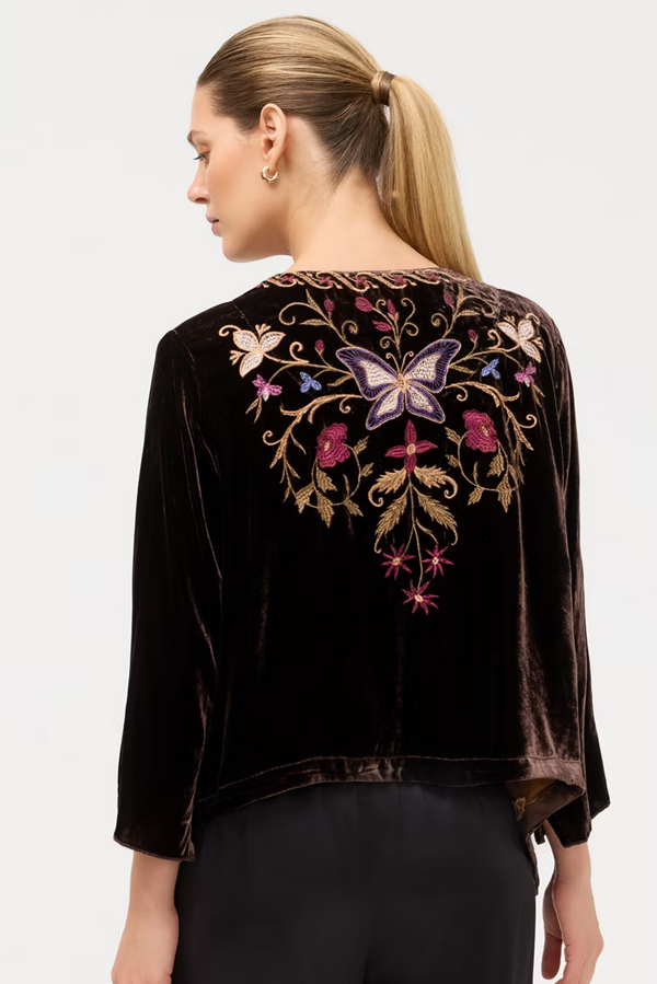Crafted from a soft silk blend, the Johnny Was Velvet Bolero Carminia Chocolate is accented by intricate embroidered florals in vibrant colour.