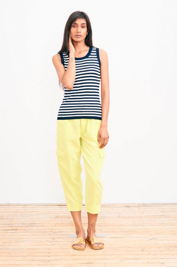 The contrasting ribbed trim on the shoulder, neck and hem compliment the stripes and give this piece an elevated finish.