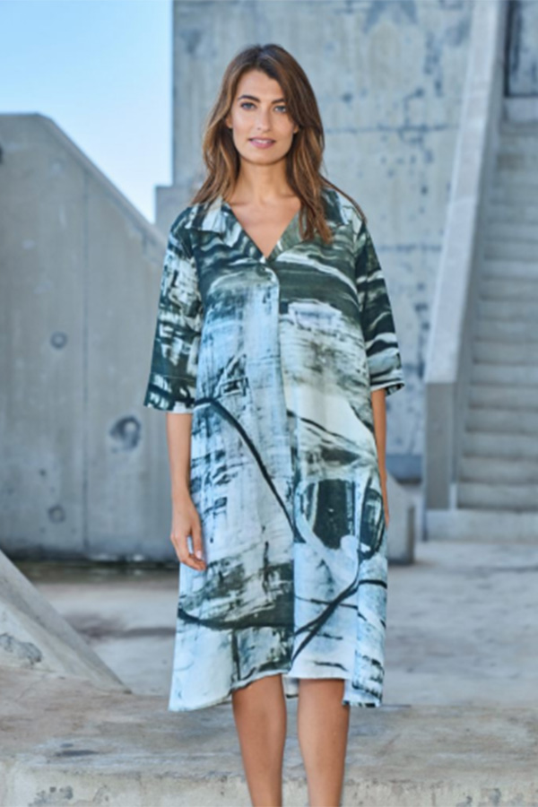 The Kokomarina Limi Dress Print Khaki features a relaxed collar, elbow length sleeves and front button up.