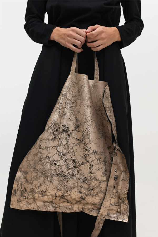 The leather La Vaca Loca Cuvo Bag GO has a folding handle and comes with a small leather zippered wallet and a cotton storage bag.