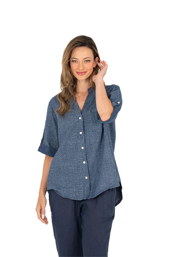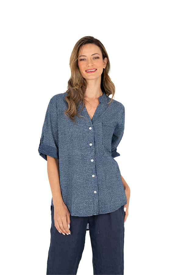 The Made In Italy Women’s Woven Shirt Navy Sailor features a front button up, shoulder covering sleeves, front pocket and a v-cut neckline.