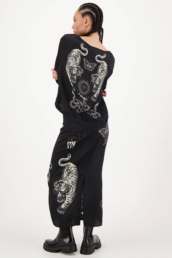 The Black Magic print decorates the Me369 Valery Slim Skirt Magic with large white graphics.