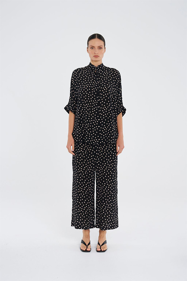 Designed with a playful spot print, loose drape and side pockets for ease, they feature soft elasticated waist and straight-leg silhouette for all day comfort and chic style.