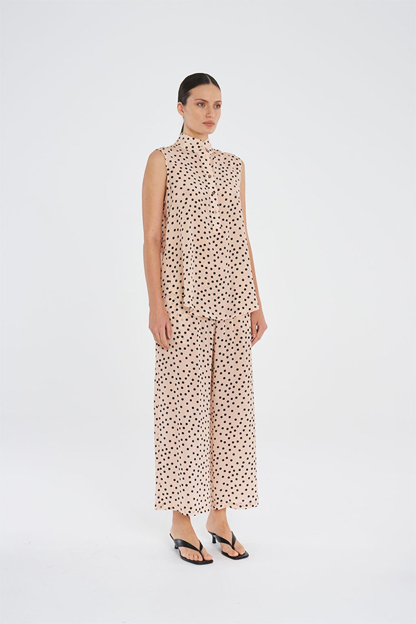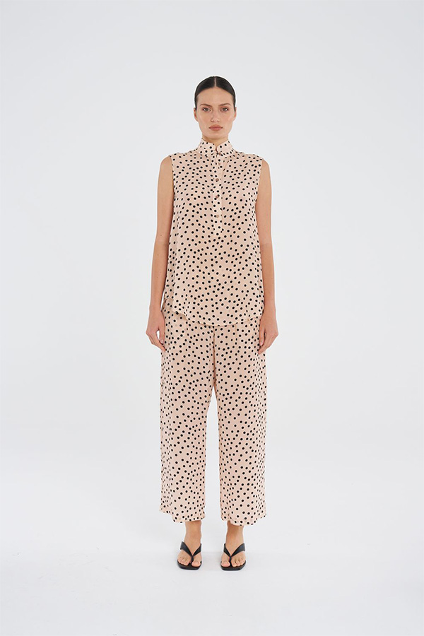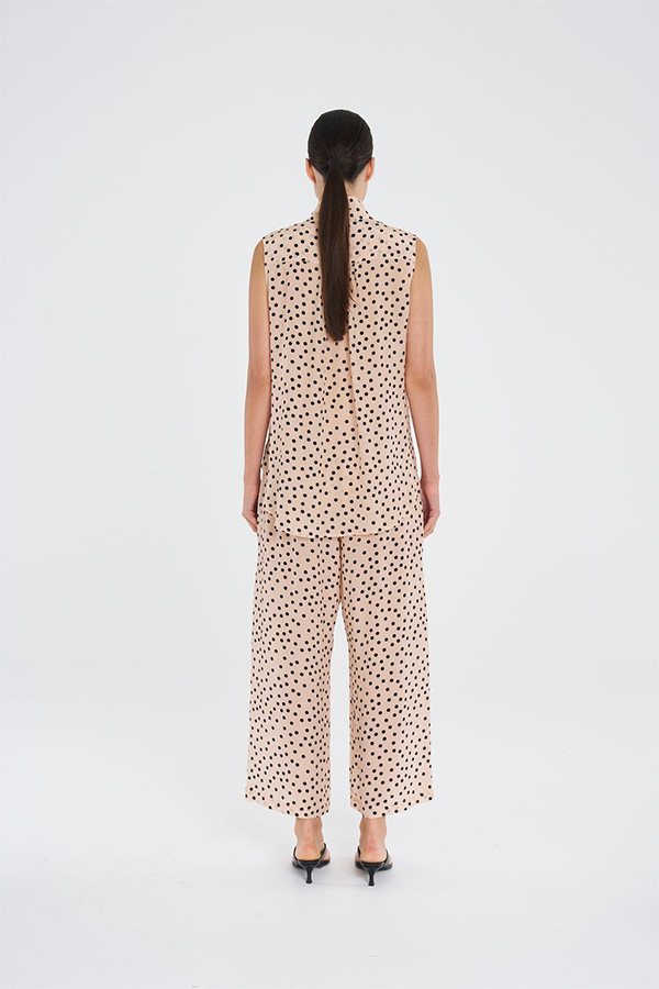 Designed with a playful spot print, loose drape and side pockets for ease, they feature soft elasticated waist and straight-leg silhouette for all day comfort and chic style.