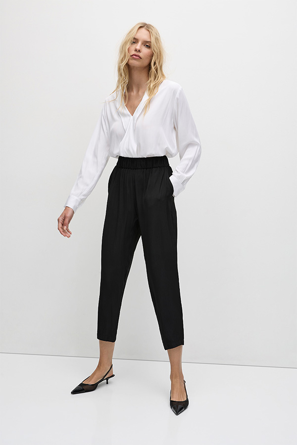 The Mela Purdie Soft Capri Black features a high waist and pants that sit above the ankle.