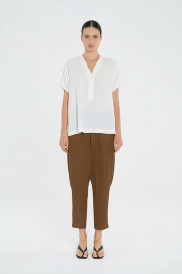 The Mela Purdie Soft Zip Pant Tannin is a relaxed pant designed with a clean silhouette and effortless everyday comfort.