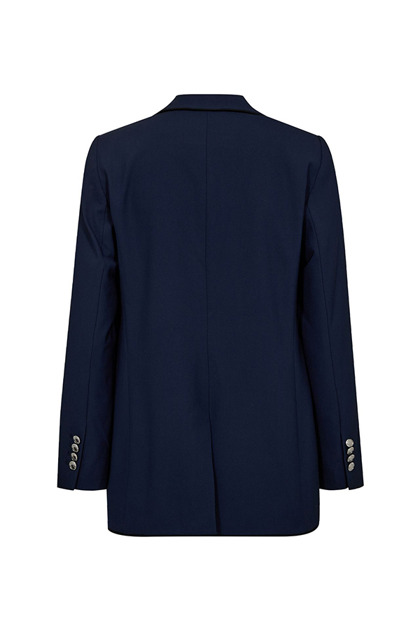 The Mos Mosh Marjurie Piet Blazer Mrtm Blue is a sharply tailored blazer in a deep navy tone, designed with a classic lapel, single-breasted front, and a softly contoured fit through the body.