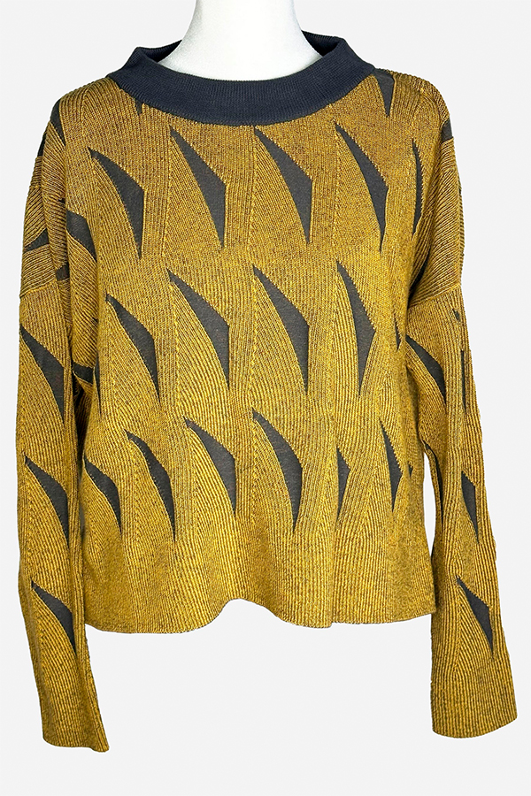 The Planet Boomerang Sweater Obsidian/Mustard is a perfect blend of coziness and contemporary elegance, the distinct feature of this sweater is its unique boomerang pattern.