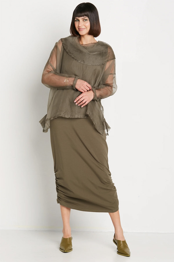 The elegant & ethereal Planet Organza Cowl Neck Top Loden is effortless refinement for any occasion.