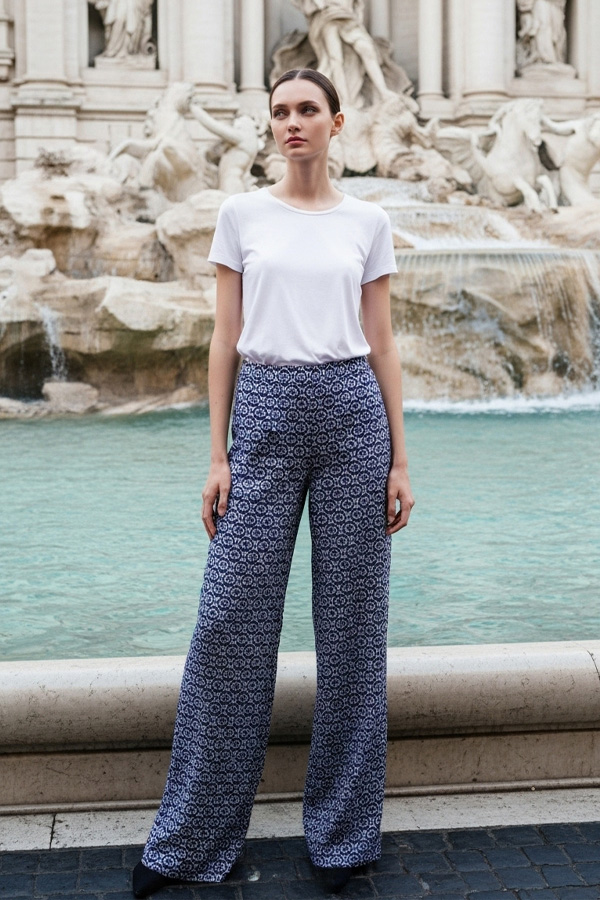 These pants are designed with a navy and white graphical patterning, a relaxed silhouette whilst holding a flattering shape.