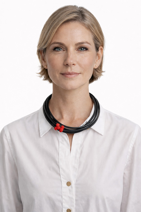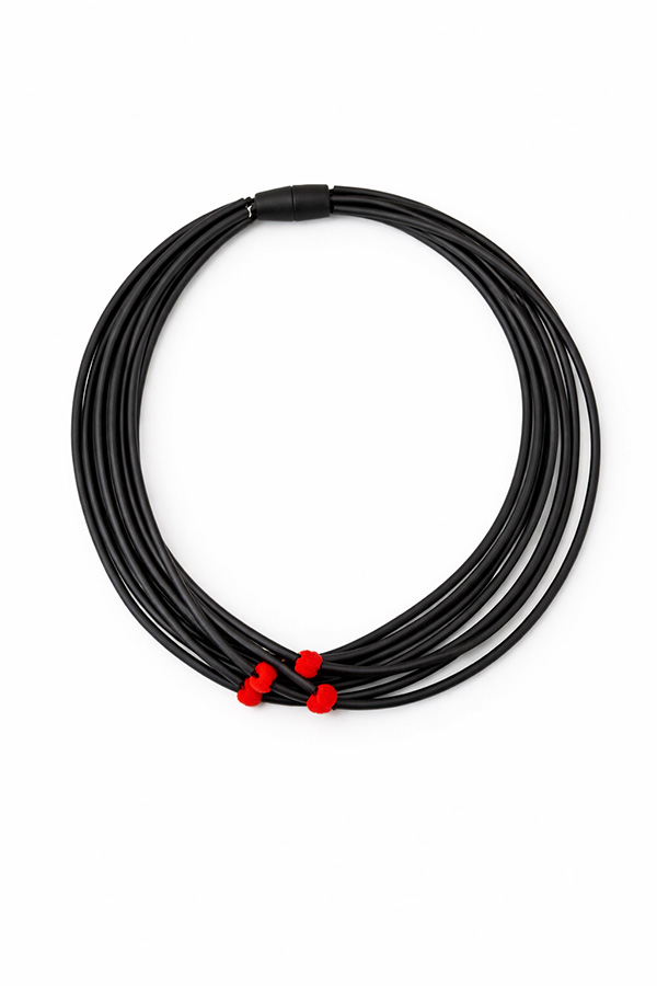 The combination of craftsmanship and high tech materials gives life to Rosalba Galati Pon Pon PVC Multistrand Necklace Titanium/Redpompom.