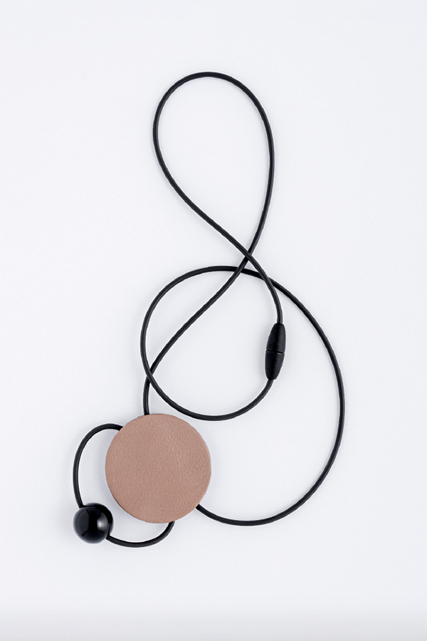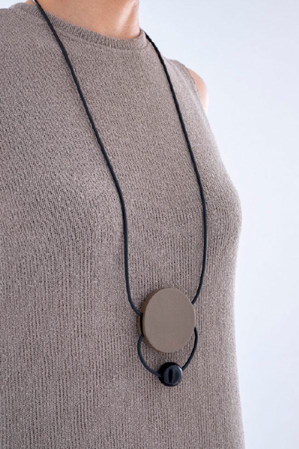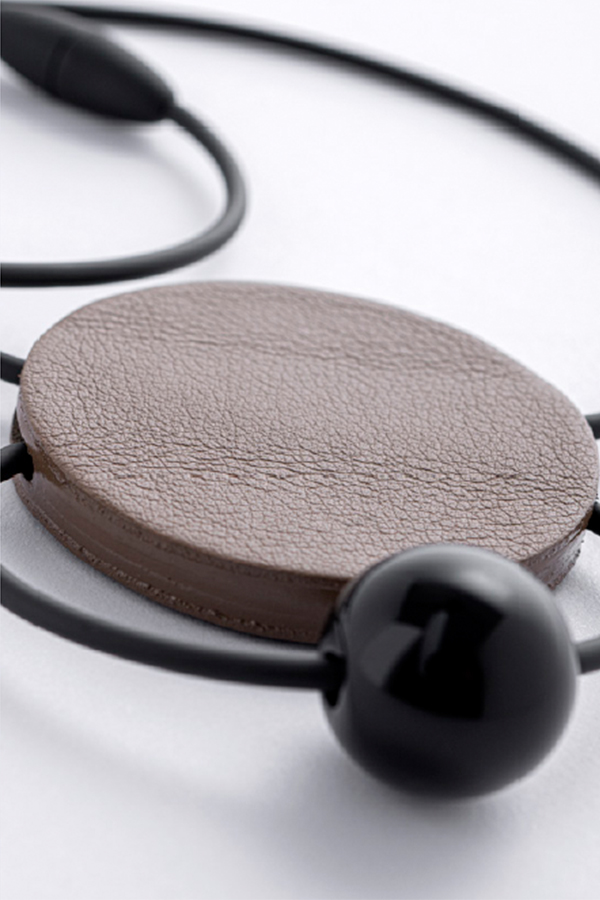 This dramatic and modern Rosalba Galati Terra Sphere Leather Shapes N Taupe Black has a secure magnetic clasp and is a long length.