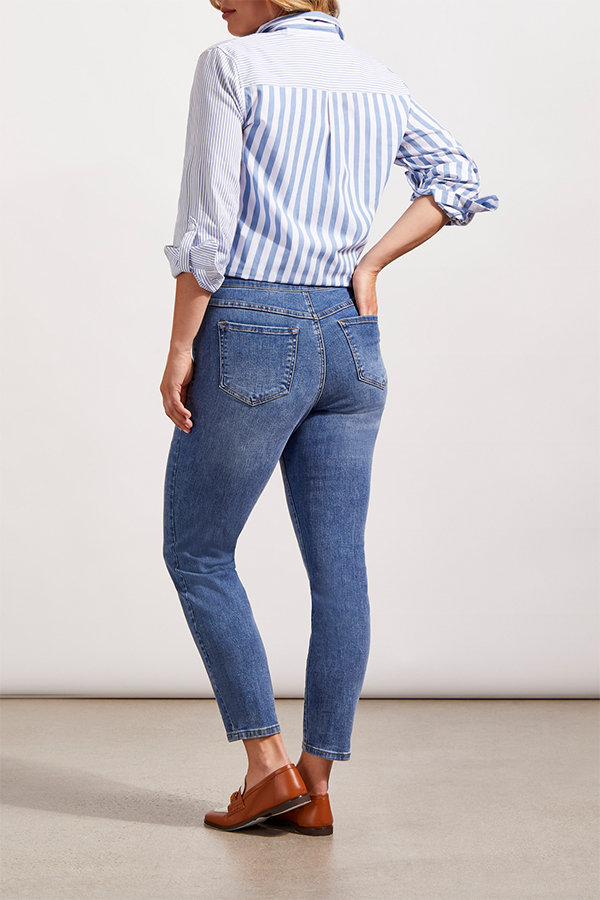 The Tribal Eco Friendly Pull-On Audrey Ankle Jegging Dk Vintage is a mid rise pull-on stretch jean with a legging style ankle.