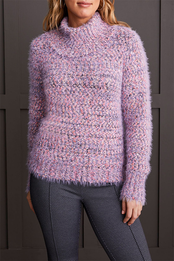 It is crafted with long sleeves and a stylish cowl neck, enhanced with a violet base and subtle specks of pink for a feminine touch.