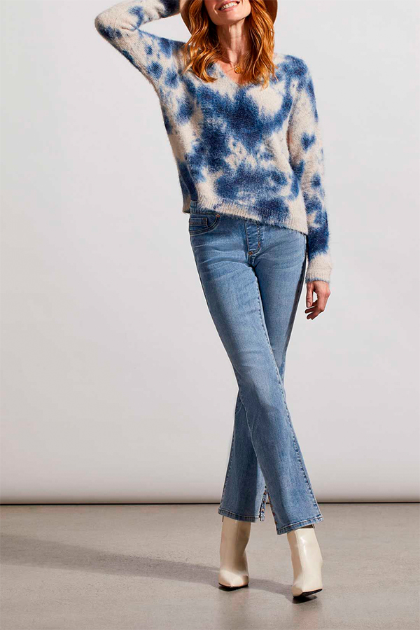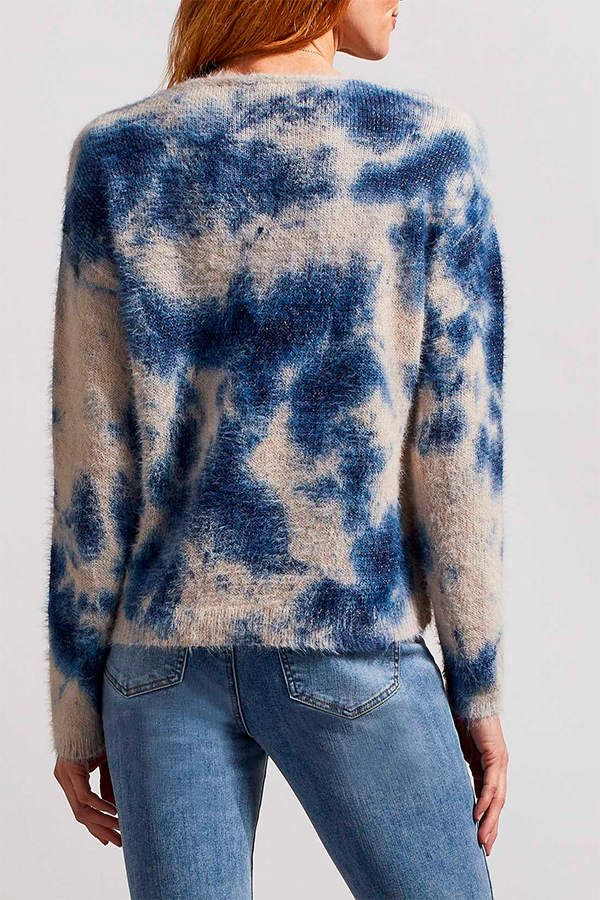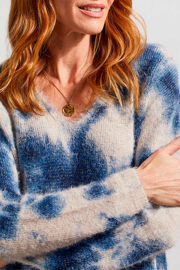 The Tribal V-Neck Sweater Bluequilt has a rounded V neckline and long sleeves.