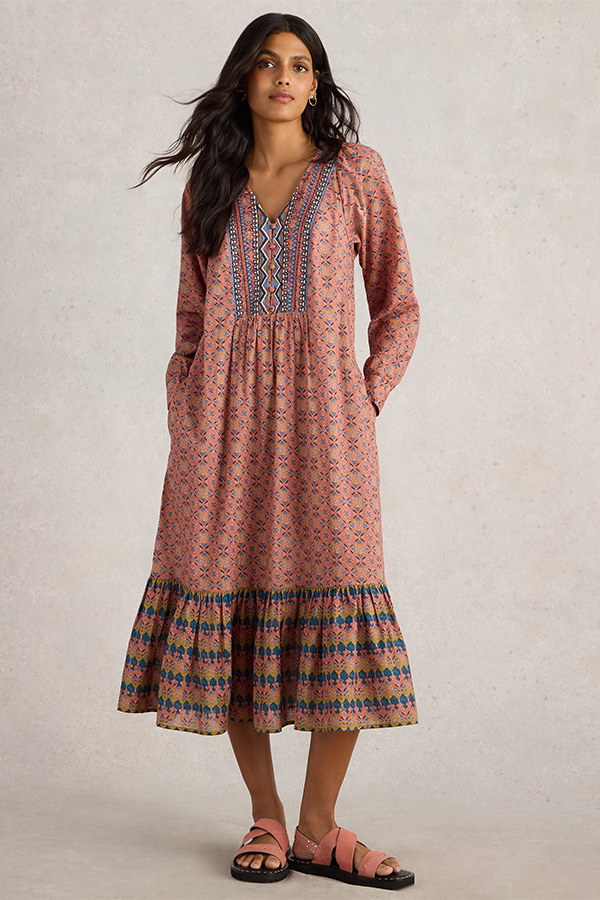 The White Stuff Abigail Embroidered Dress Pink Mlt features a V-neckline, long sleeves and is cut above ankle length.