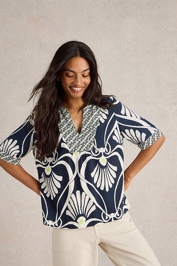 The White Stuff Ash Linen Blend Top Navy PR features a V-neckline, short sleeves and a relaxed fit.