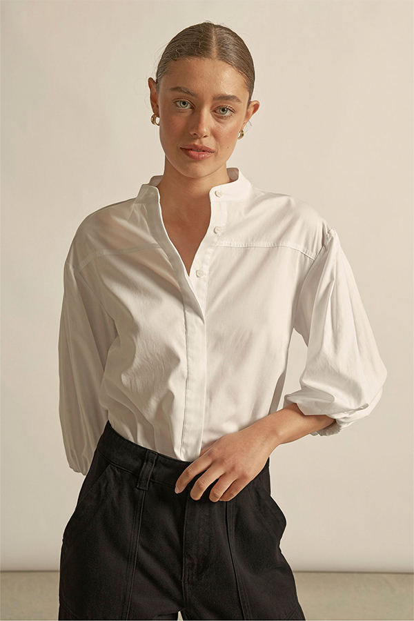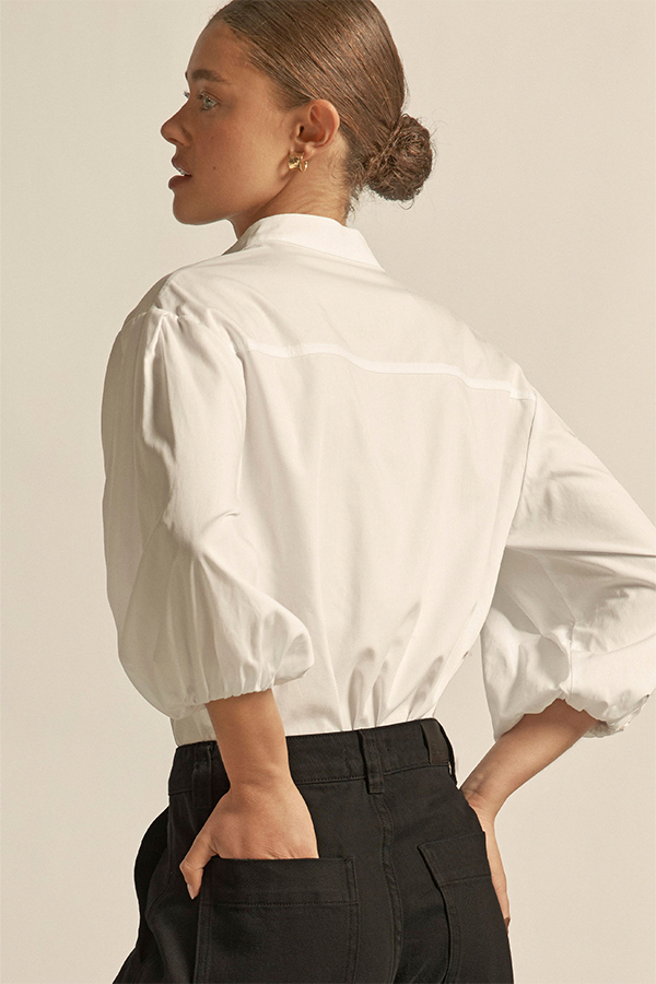 The crisp porcelain white tone is complemented by soft volume through the sleeves and a clean stand collar for an elegant finish.